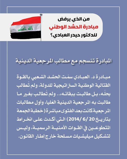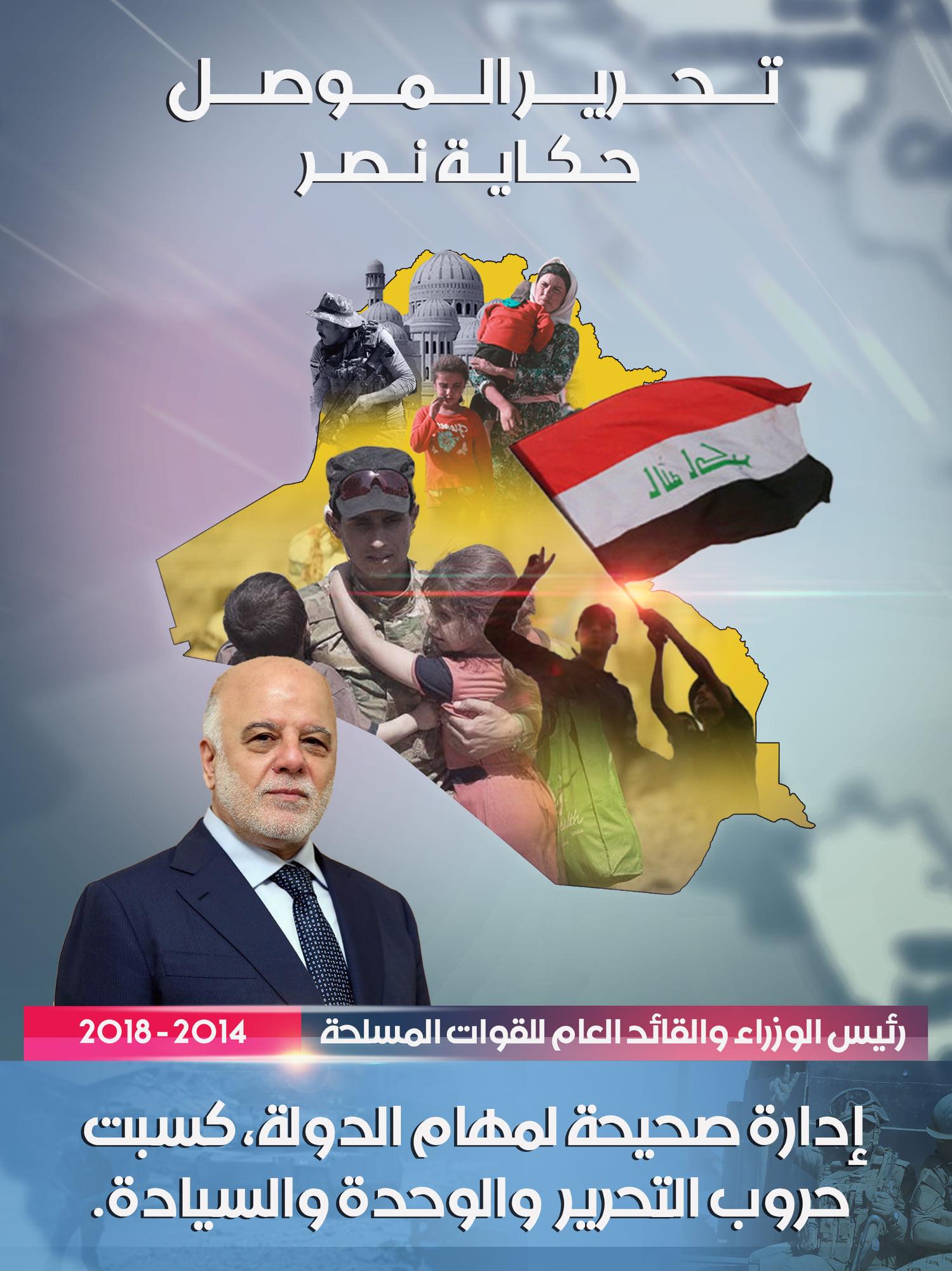 • إئتلاف النصر: مشروع وطني بقيادة الدكتور حيدر العبادي، يهدف لبناء وإدارة الدولة العراقية وفق مقومات الحكم الرشيد،.. يعمل لجميع العراقيين بقومياتهم وأديانهم وطوائفهم كافة، لتحقيق الوحدة والعدالة والسيادة والرفاه.