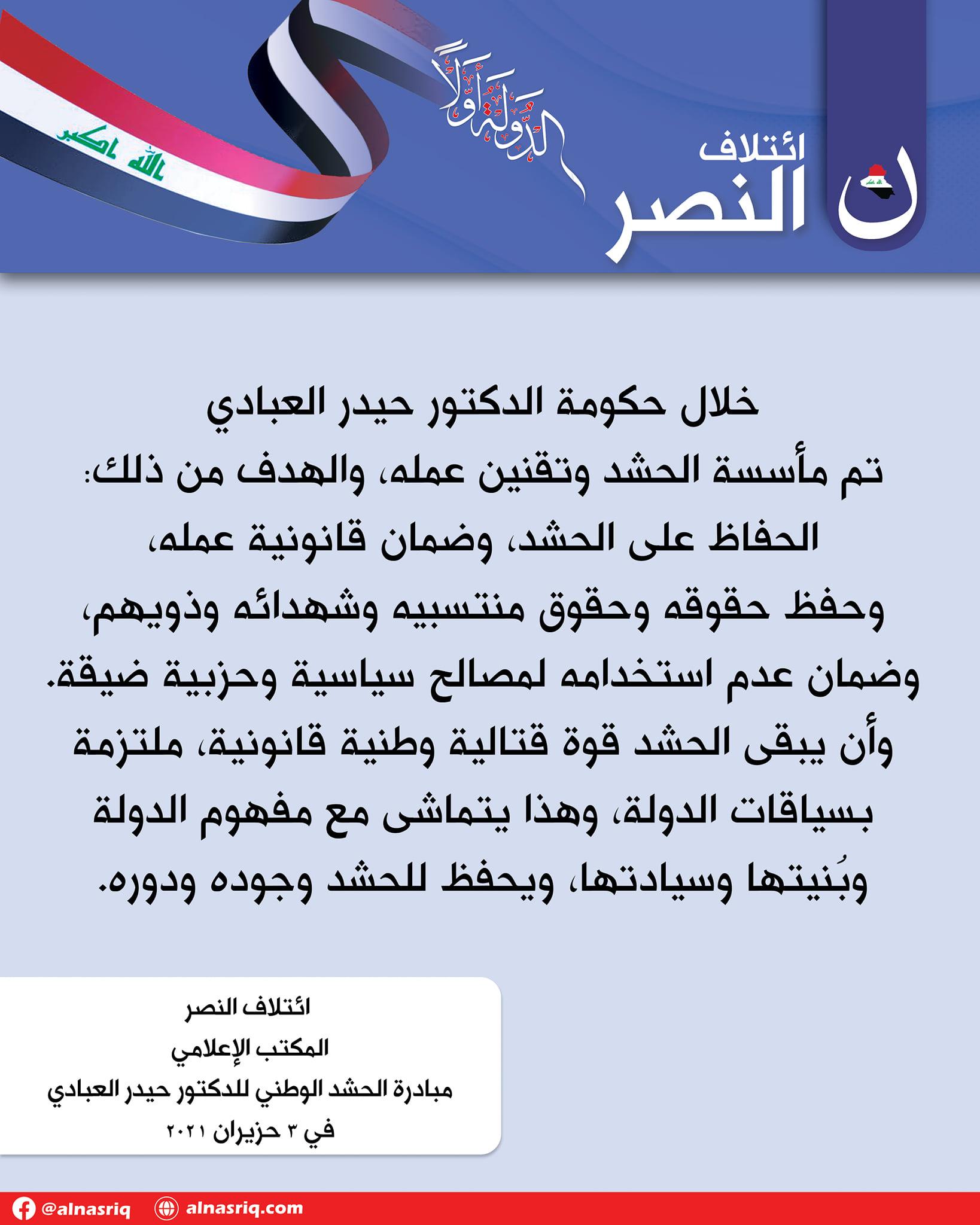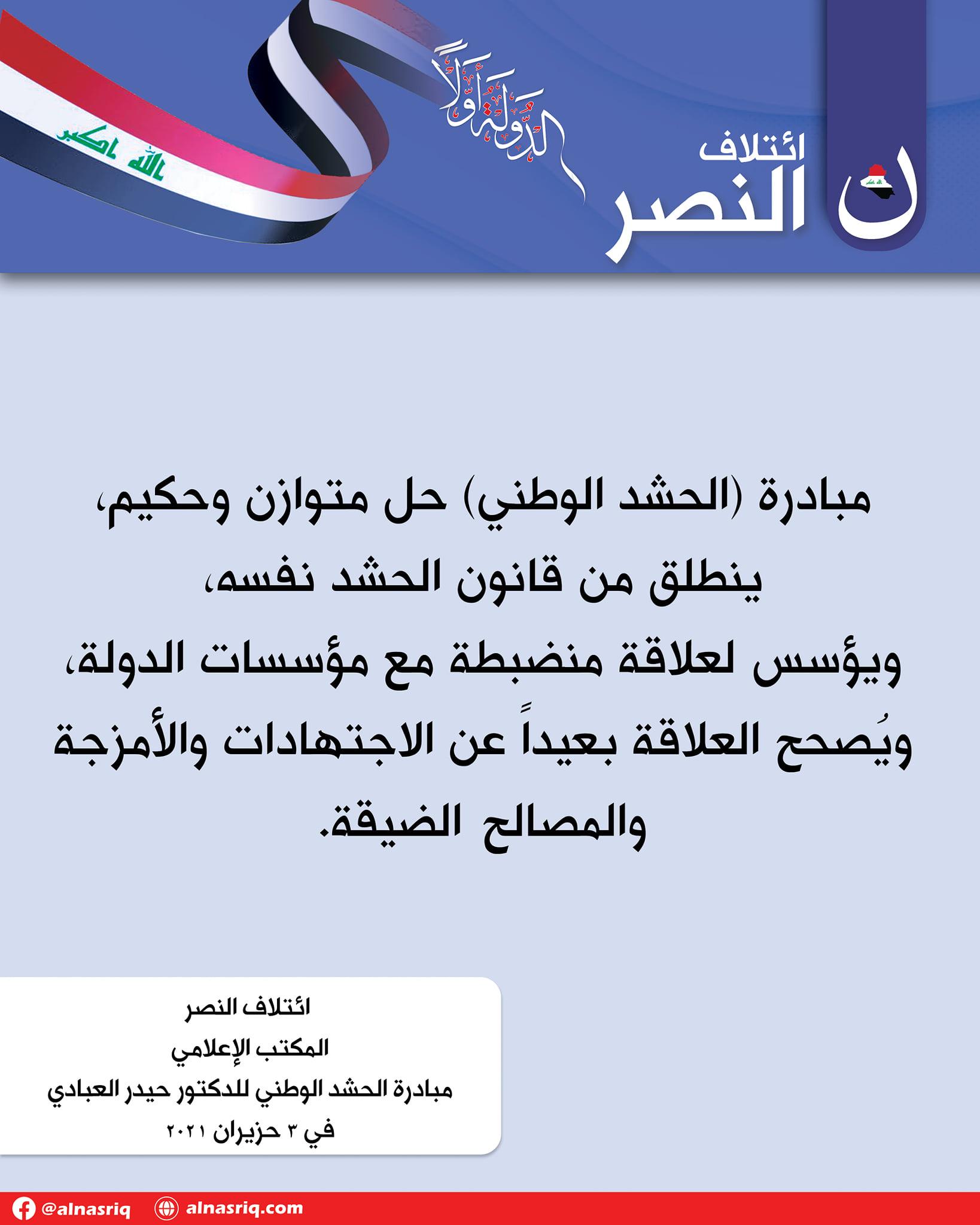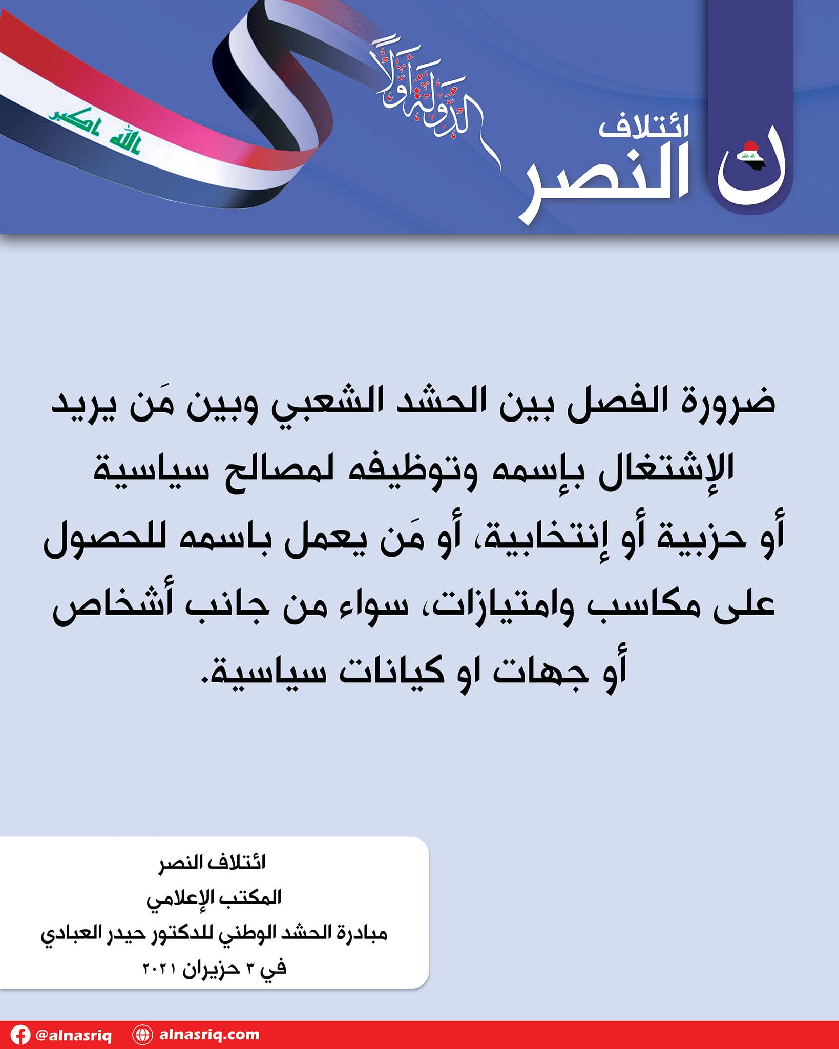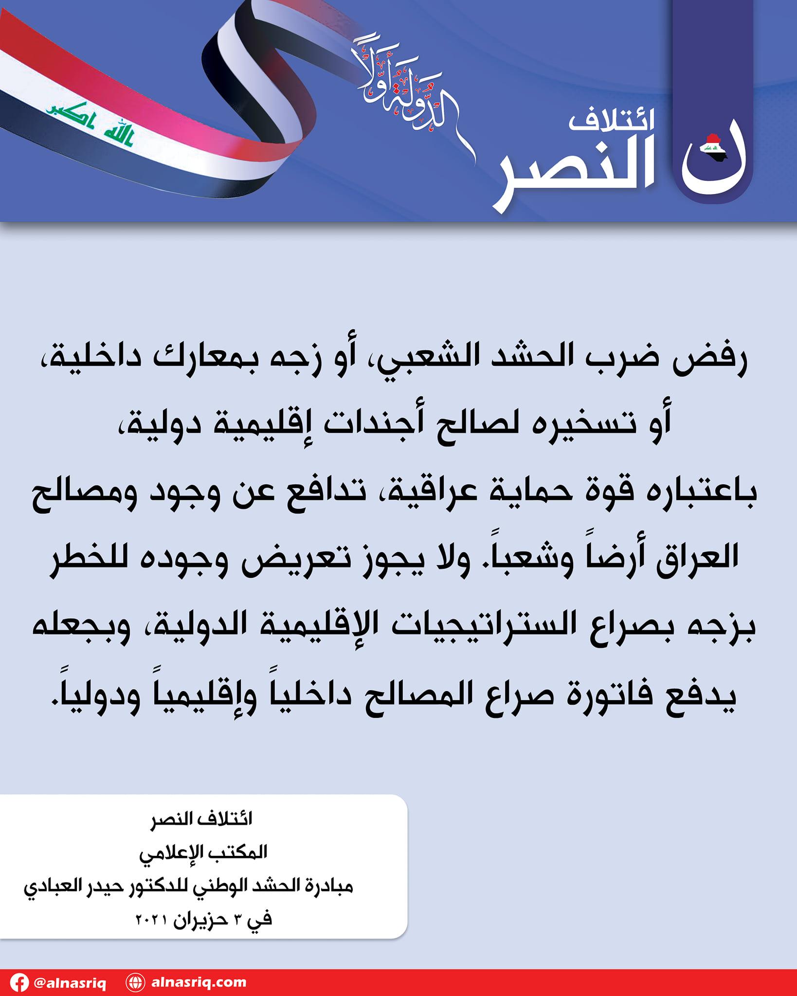 • إئتلاف النصر: مشروع وطني بقيادة الدكتور حيدر العبادي، يهدف لبناء وإدارة الدولة العراقية وفق مقومات الحكم الرشيد،.. يعمل لجميع العراقيين بقومياتهم وأديانهم وطوائفهم كافة، لتحقيق الوحدة والعدالة والسيادة والرفاه.