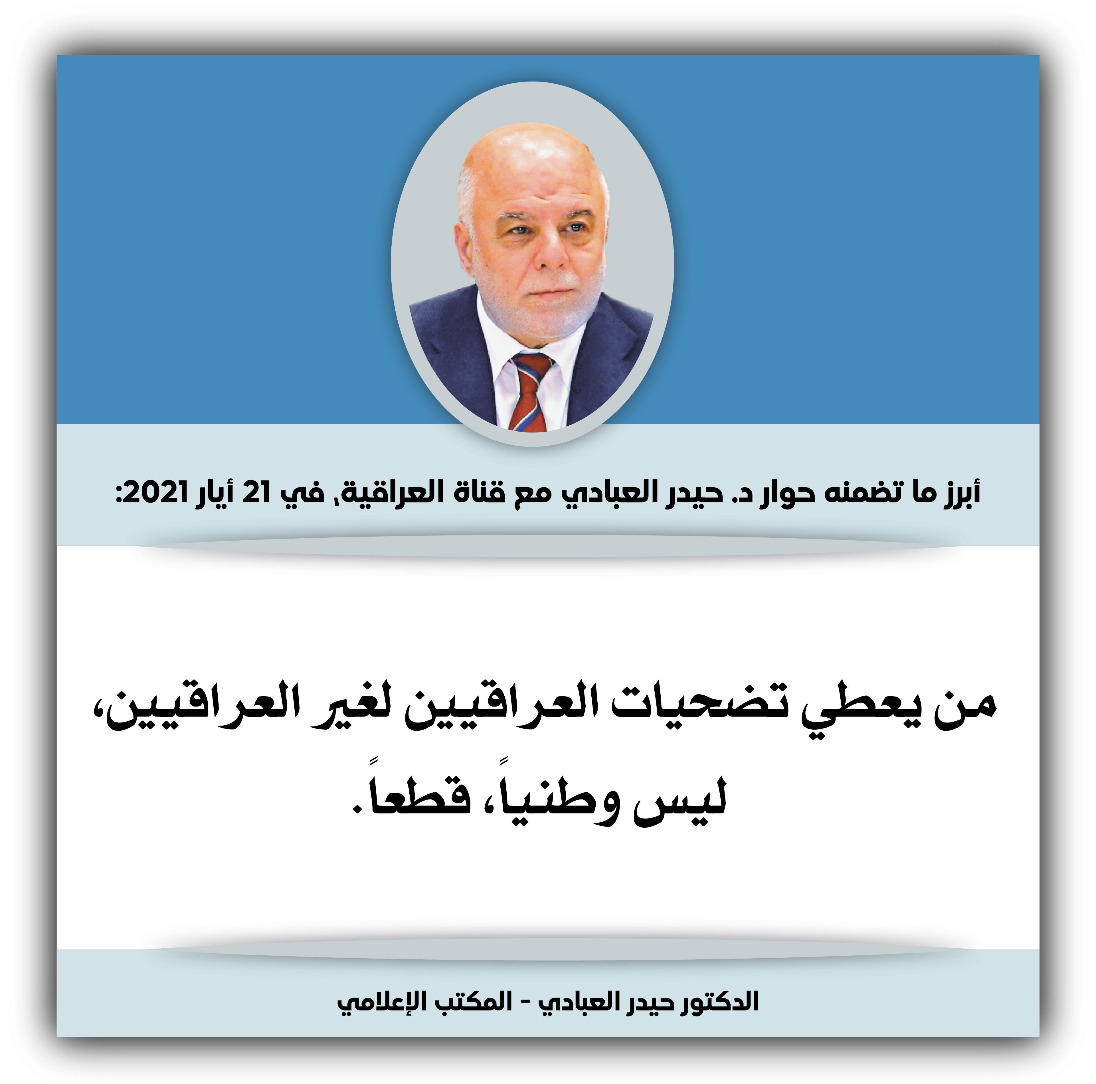 • إئتلاف النصر: مشروع وطني بقيادة الدكتور حيدر العبادي، يهدف لبناء وإدارة الدولة العراقية وفق مقومات الحكم الرشيد،.. يعمل لجميع العراقيين بقومياتهم وأديانهم وطوائفهم كافة، لتحقيق الوحدة والعدالة والسيادة والرفاه.