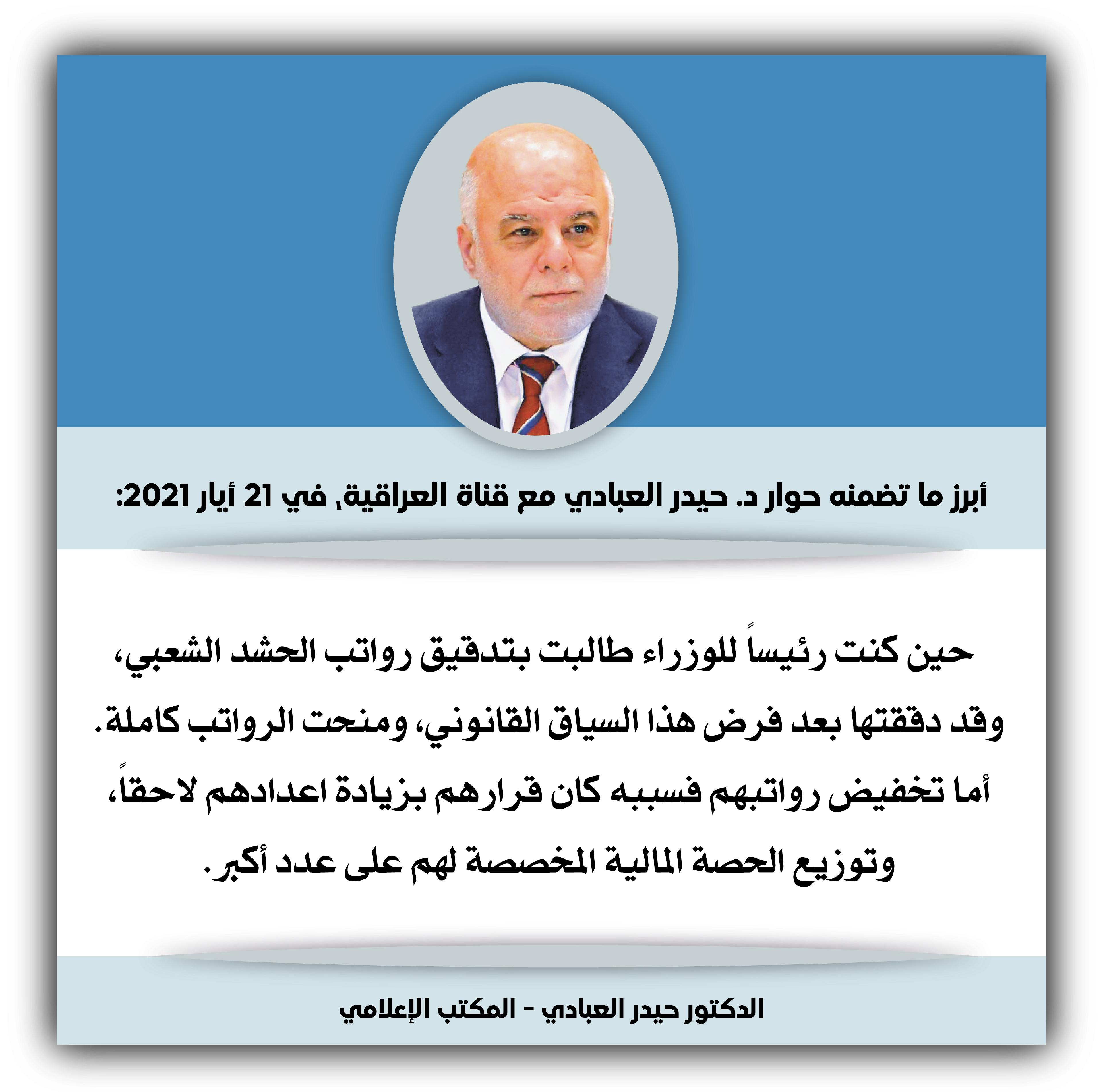 العبادي: أنصح رئيس الوزراء بعدم الدخول في المعارك الجانبية وأن يركز في الأمور الأساسية