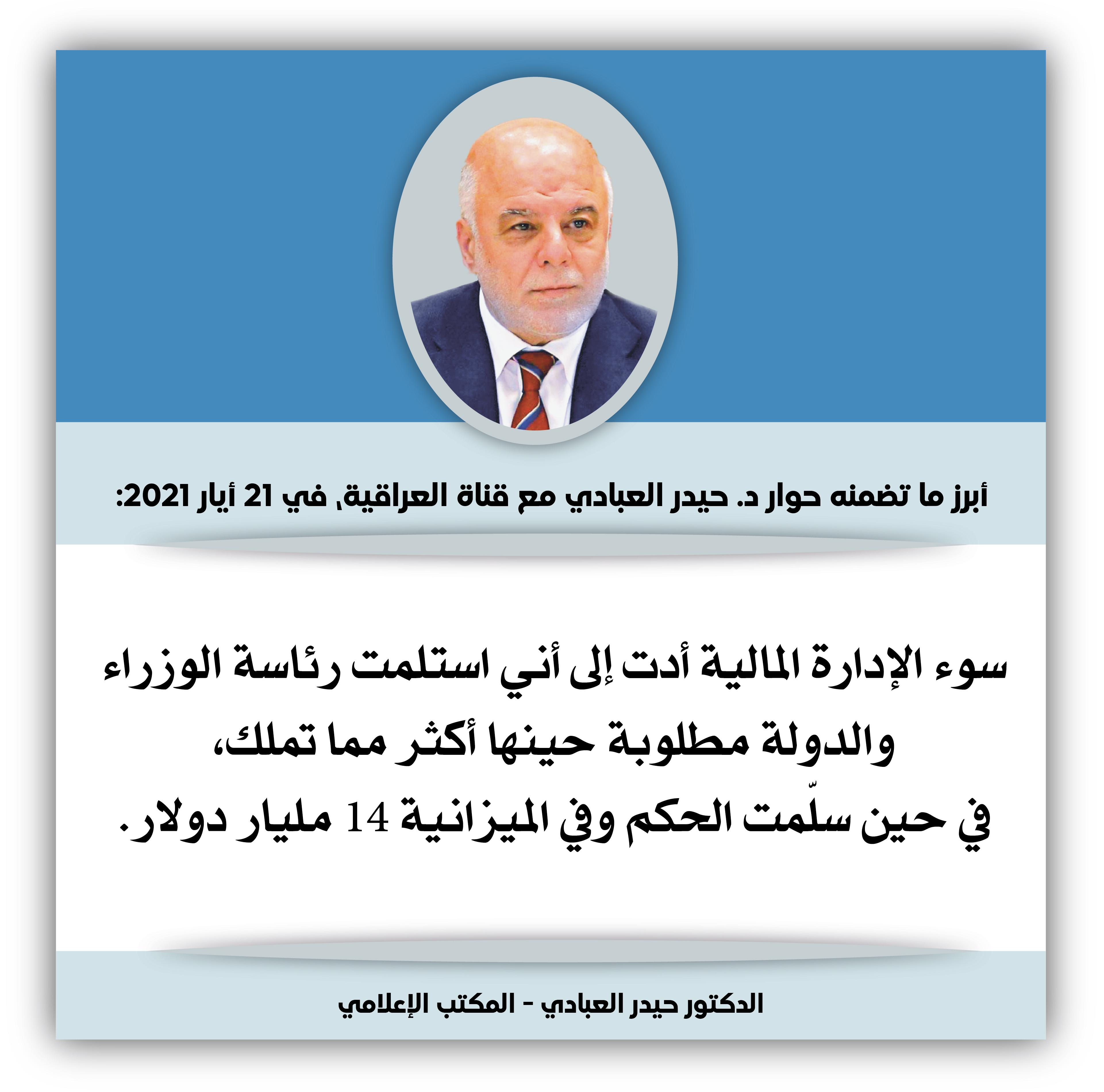 العبادي: حماية الناس وكرامتهم مسؤولية الدولة ويمكن إدارة الاقتصاد بموارد قليلة إذا انضبط الإنفاق