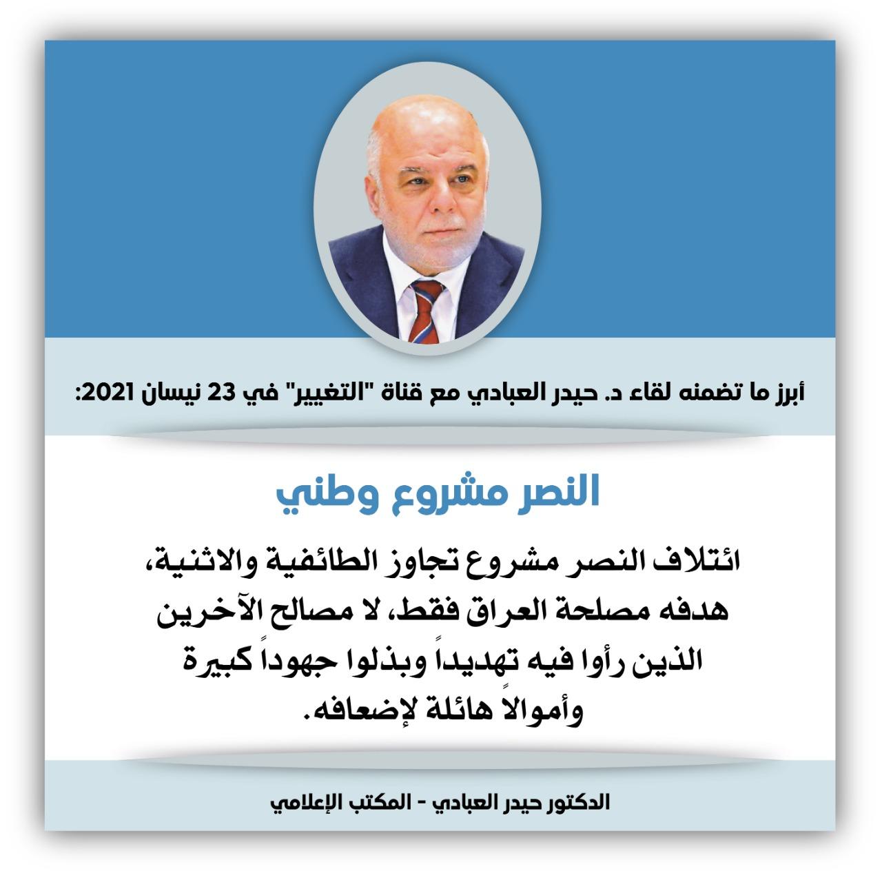 • إئتلاف النصر: مشروع وطني بقيادة الدكتور حيدر العبادي، يهدف لبناء وإدارة الدولة العراقية وفق مقومات الحكم الرشيد،.. يعمل لجميع العراقيين بقومياتهم وأديانهم وطوائفهم كافة، لتحقيق الوحدة والعدالة والسيادة والرفاه.