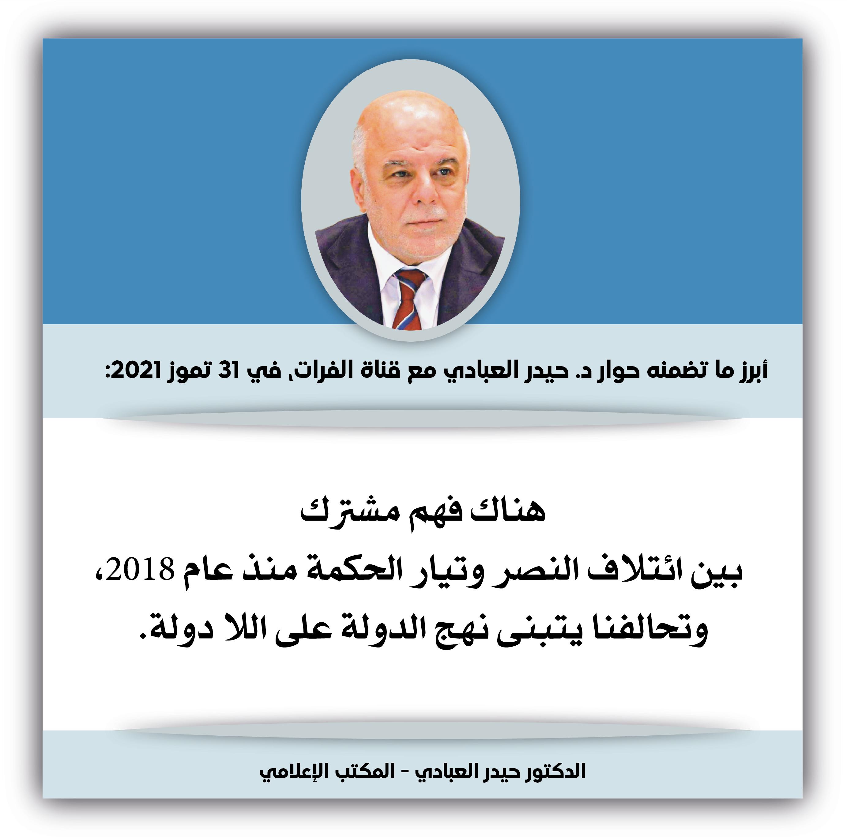 • إئتلاف النصر: مشروع وطني بقيادة الدكتور حيدر العبادي، يهدف لبناء وإدارة الدولة العراقية وفق مقومات الحكم الرشيد،.. يعمل لجميع العراقيين بقومياتهم وأديانهم وطوائفهم كافة، لتحقيق الوحدة والعدالة والسيادة والرفاه.