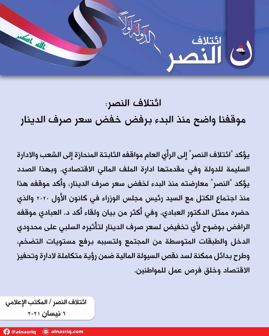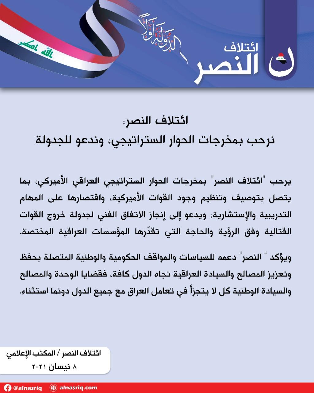 • إئتلاف النصر: مشروع وطني بقيادة الدكتور حيدر العبادي، يهدف لبناء وإدارة الدولة العراقية وفق مقومات الحكم الرشيد،.. يعمل لجميع العراقيين بقومياتهم وأديانهم وطوائفهم كافة، لتحقيق الوحدة والعدالة والسيادة والرفاه.