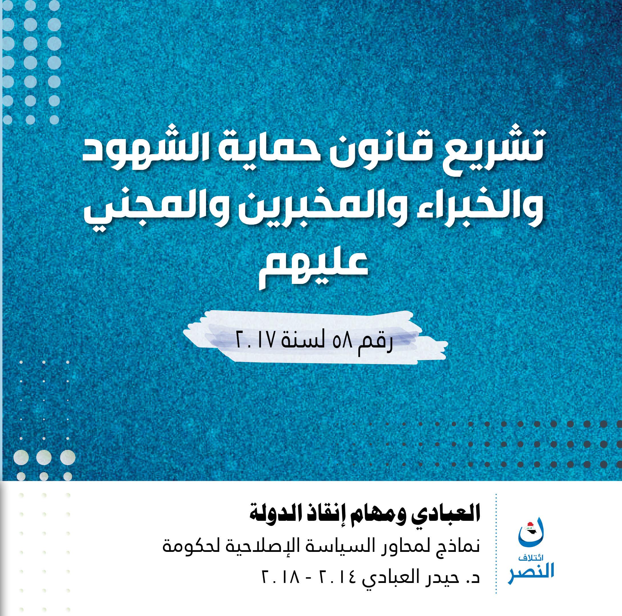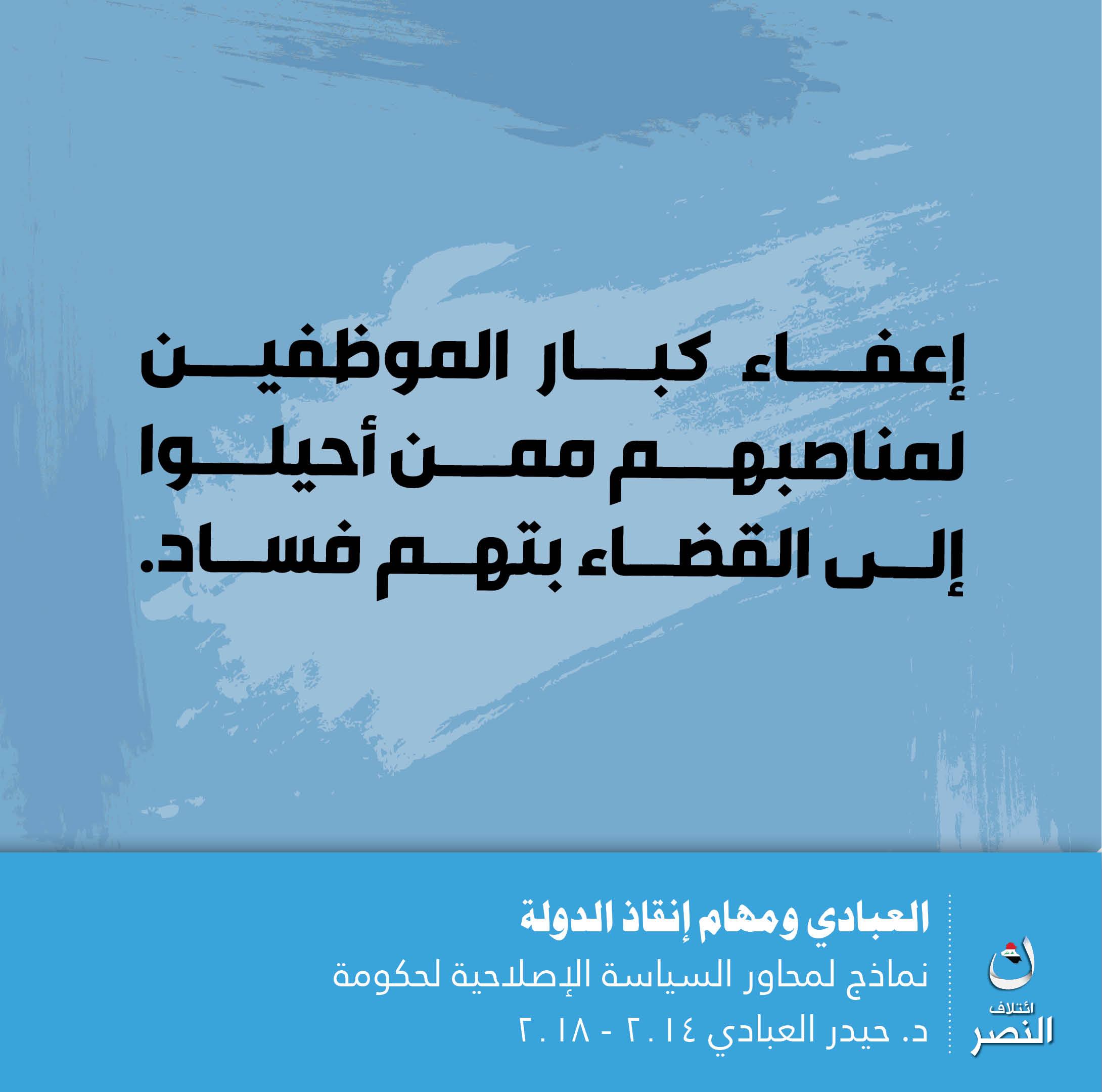 • إئتلاف النصر: مشروع وطني بقيادة الدكتور حيدر العبادي، يهدف لبناء وإدارة الدولة العراقية وفق مقومات الحكم الرشيد،.. يعمل لجميع العراقيين بقومياتهم وأديانهم وطوائفهم كافة، لتحقيق الوحدة والعدالة والسيادة والرفاه.