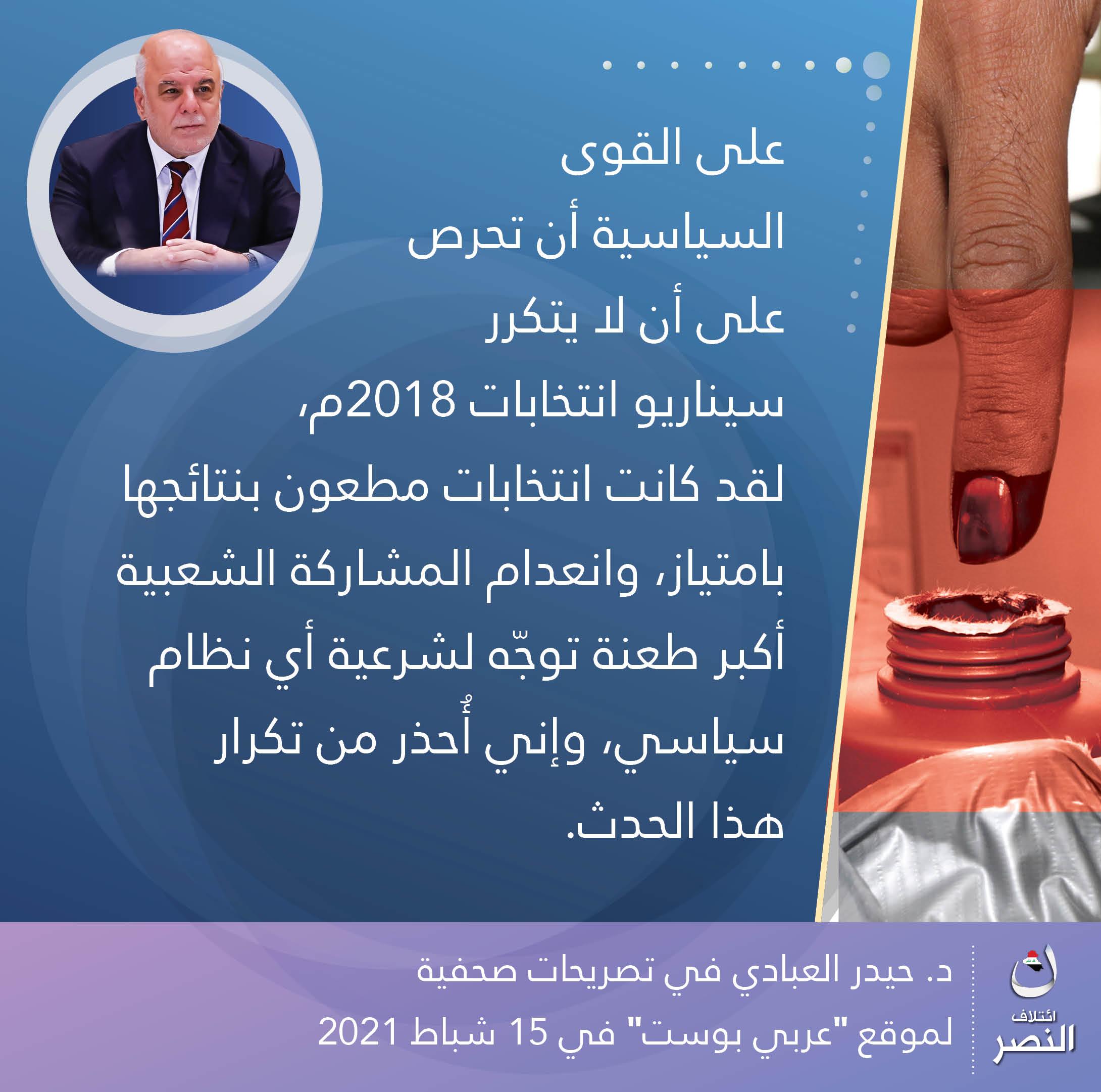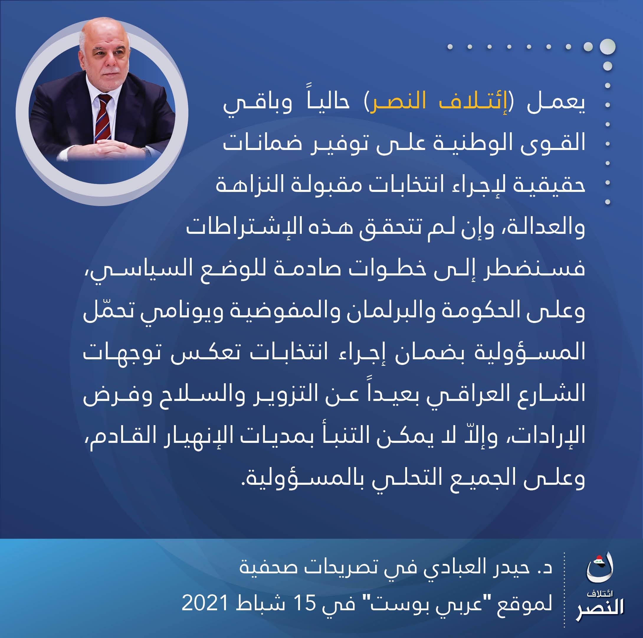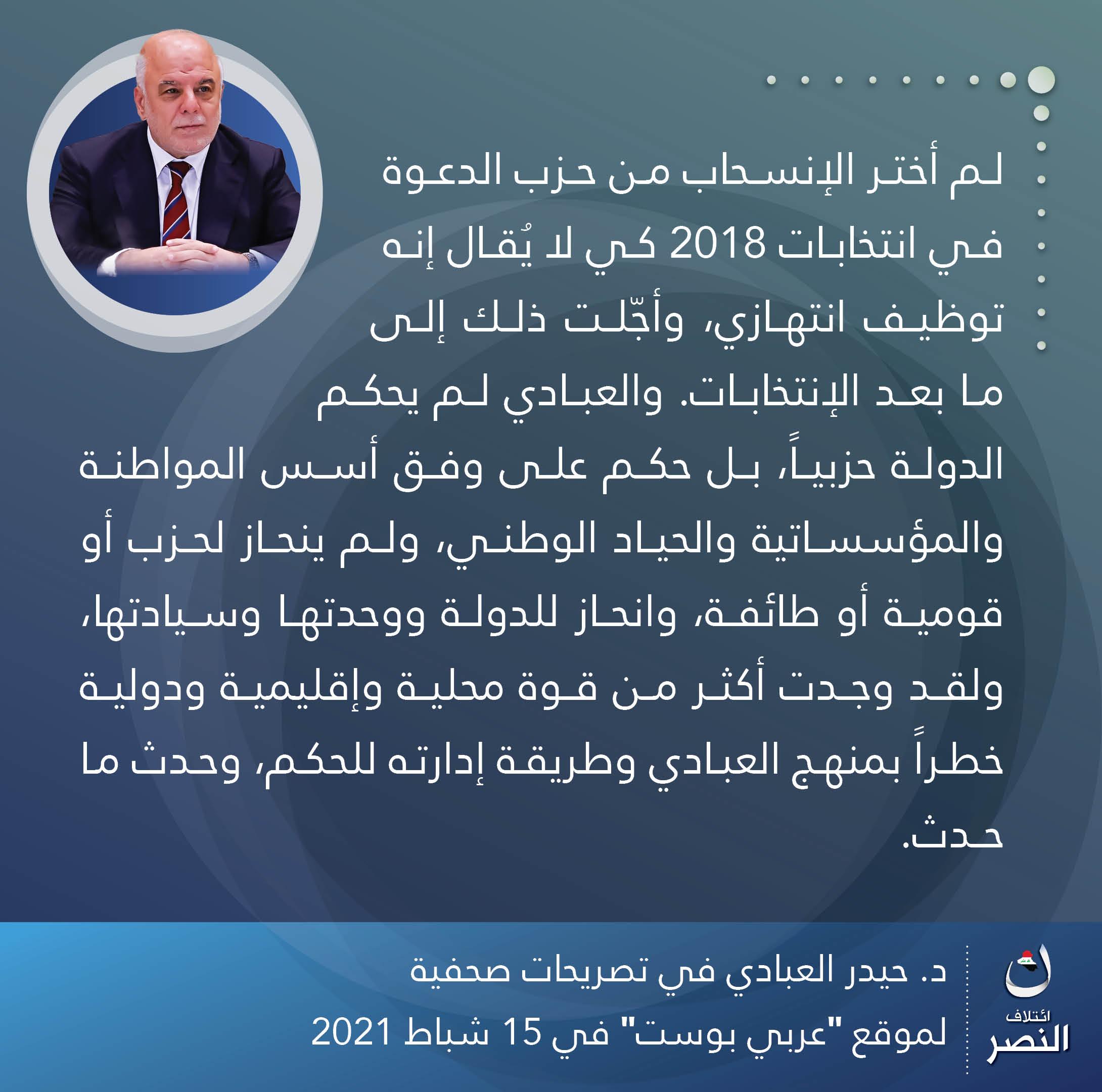 • إئتلاف النصر: مشروع وطني بقيادة الدكتور حيدر العبادي، يهدف لبناء وإدارة الدولة العراقية وفق مقومات الحكم الرشيد،.. يعمل لجميع العراقيين بقومياتهم وأديانهم وطوائفهم كافة، لتحقيق الوحدة والعدالة والسيادة والرفاه.