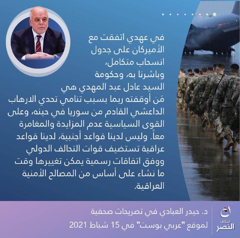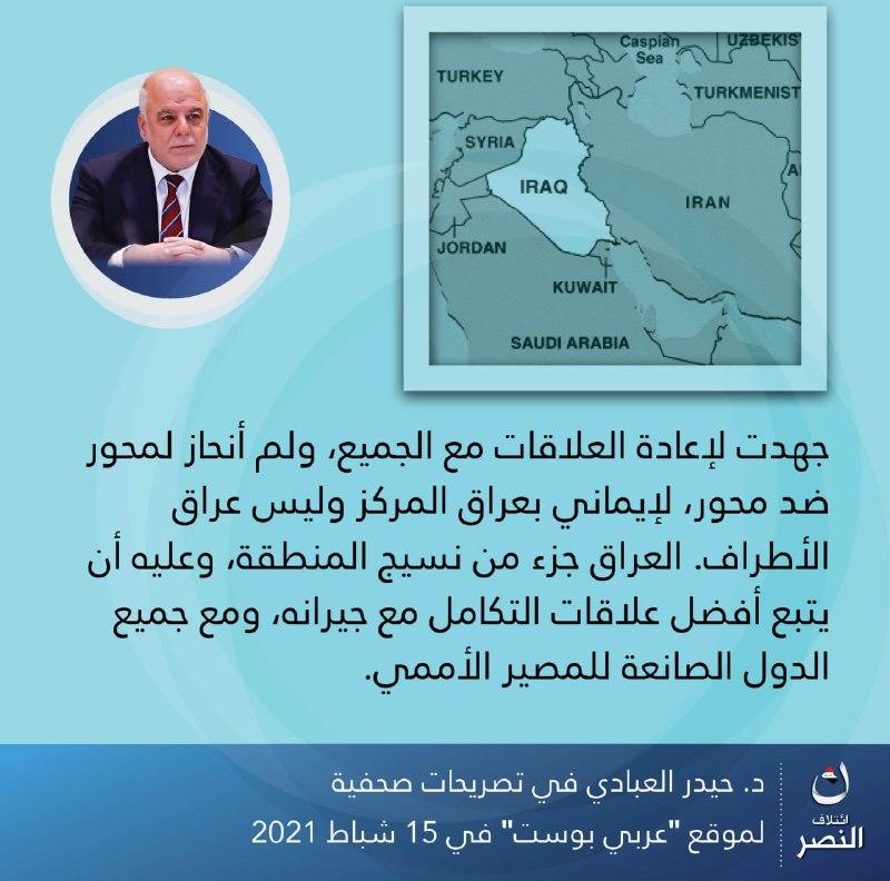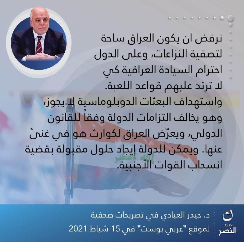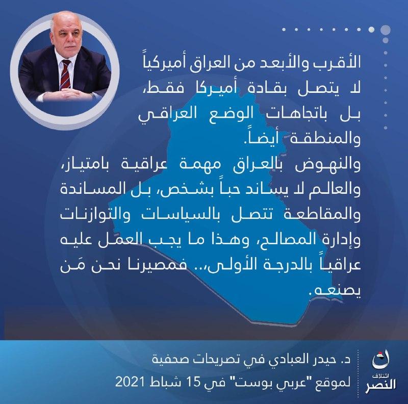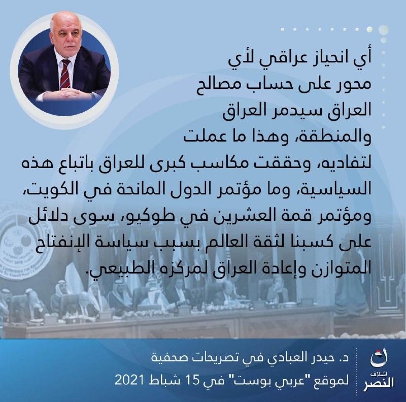 • إئتلاف النصر: مشروع وطني بقيادة الدكتور حيدر العبادي، يهدف لبناء وإدارة الدولة العراقية وفق مقومات الحكم الرشيد،.. يعمل لجميع العراقيين بقومياتهم وأديانهم وطوائفهم كافة، لتحقيق الوحدة والعدالة والسيادة والرفاه.