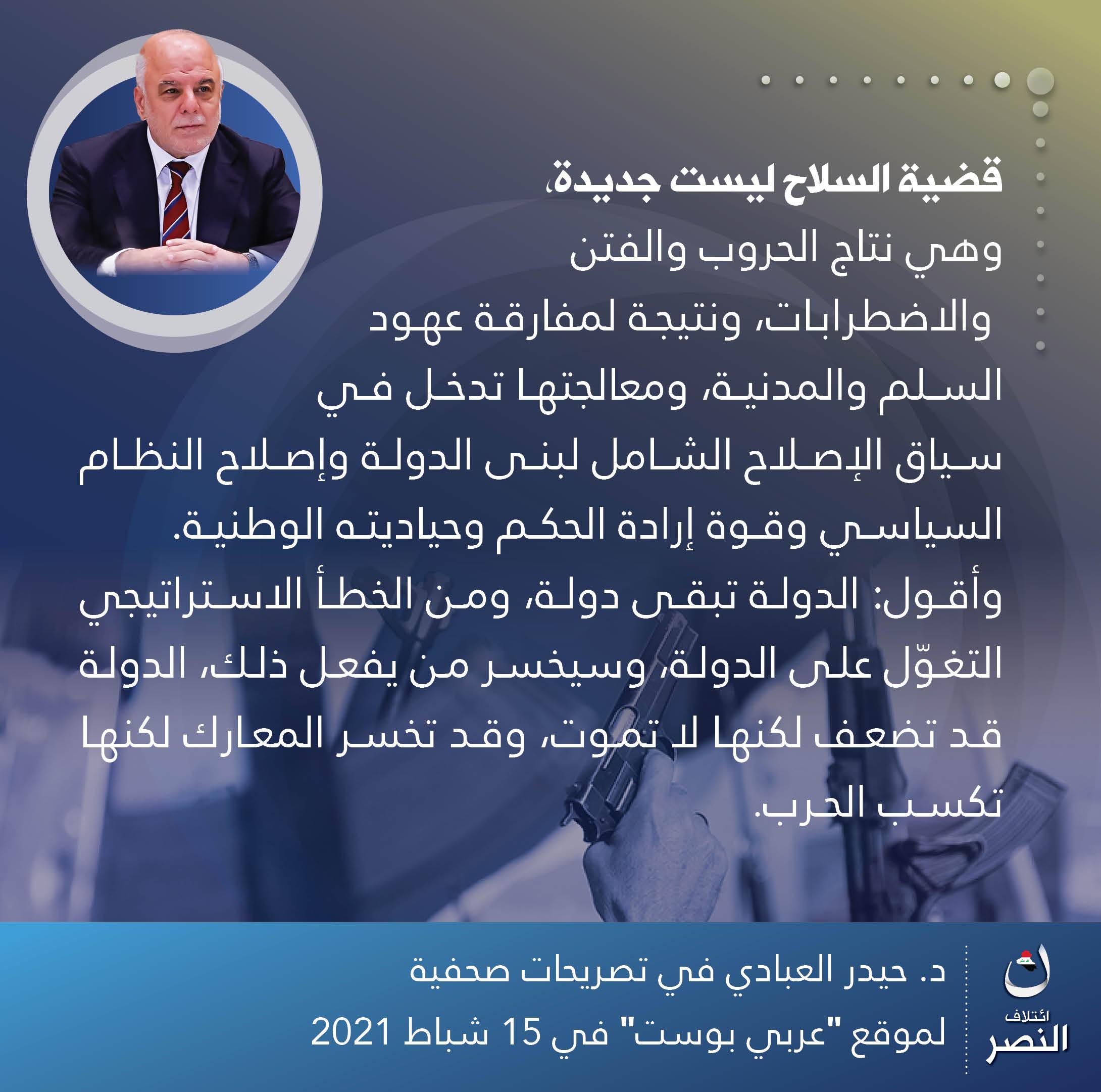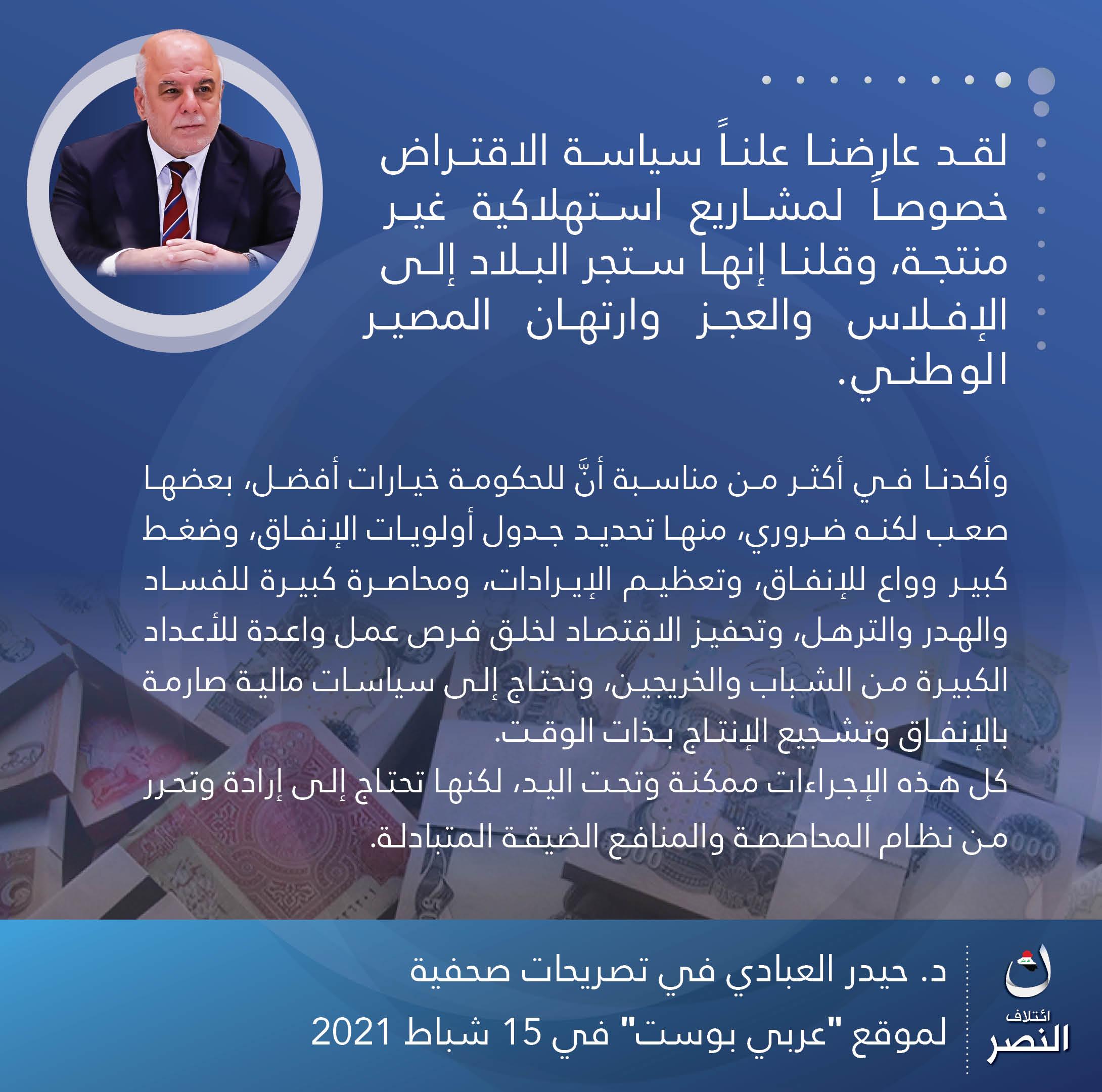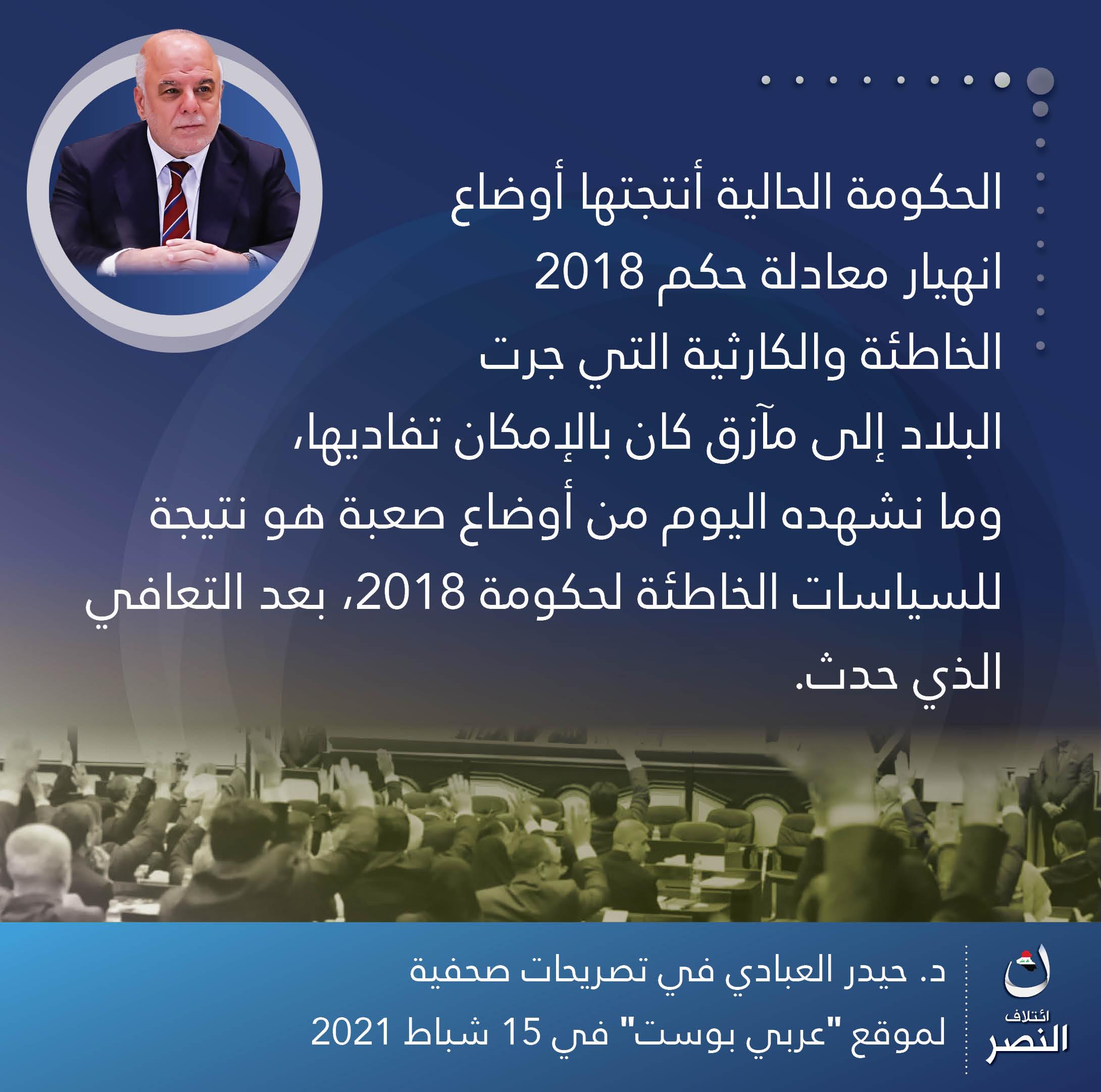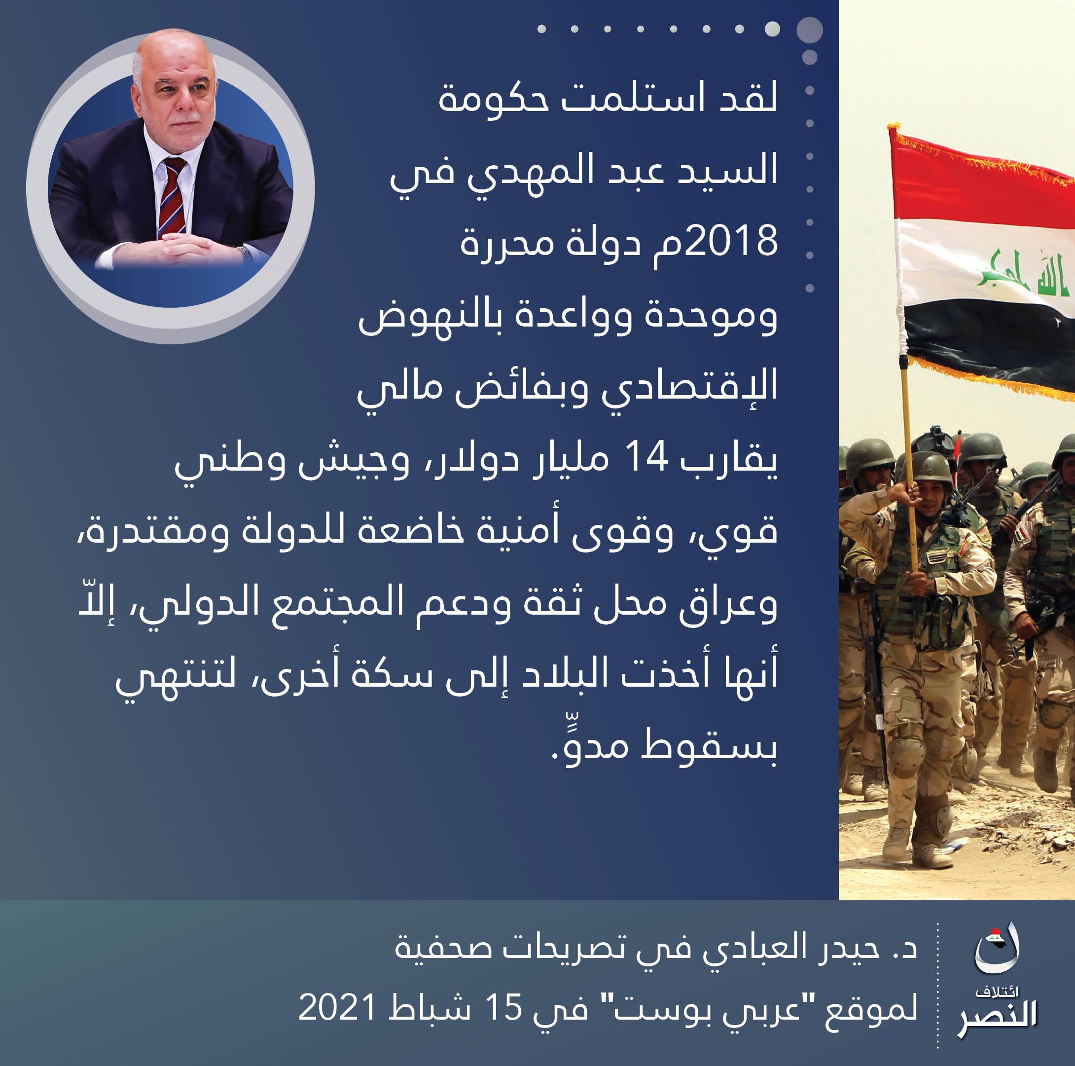 • إئتلاف النصر: مشروع وطني بقيادة الدكتور حيدر العبادي، يهدف لبناء وإدارة الدولة العراقية وفق مقومات الحكم الرشيد،.. يعمل لجميع العراقيين بقومياتهم وأديانهم وطوائفهم كافة، لتحقيق الوحدة والعدالة والسيادة والرفاه.
