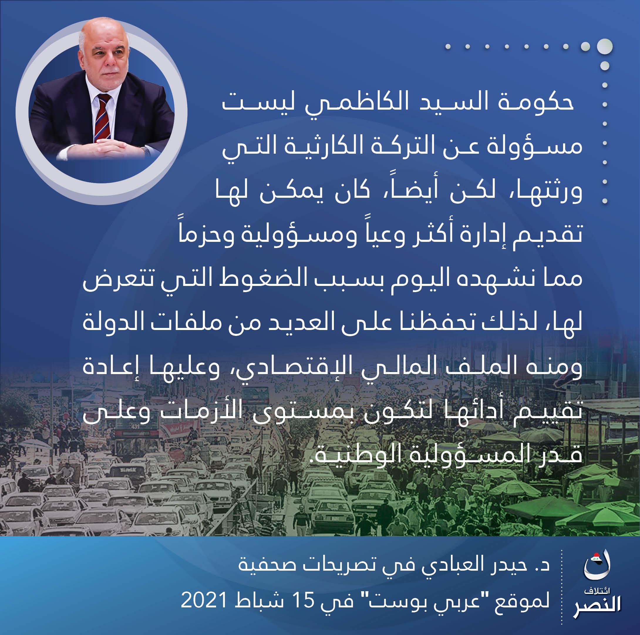 العبادي: حماية الناس وكرامتهم مسؤولية الدولة ويمكن إدارة الاقتصاد بموارد قليلة إذا انضبط الإنفاق