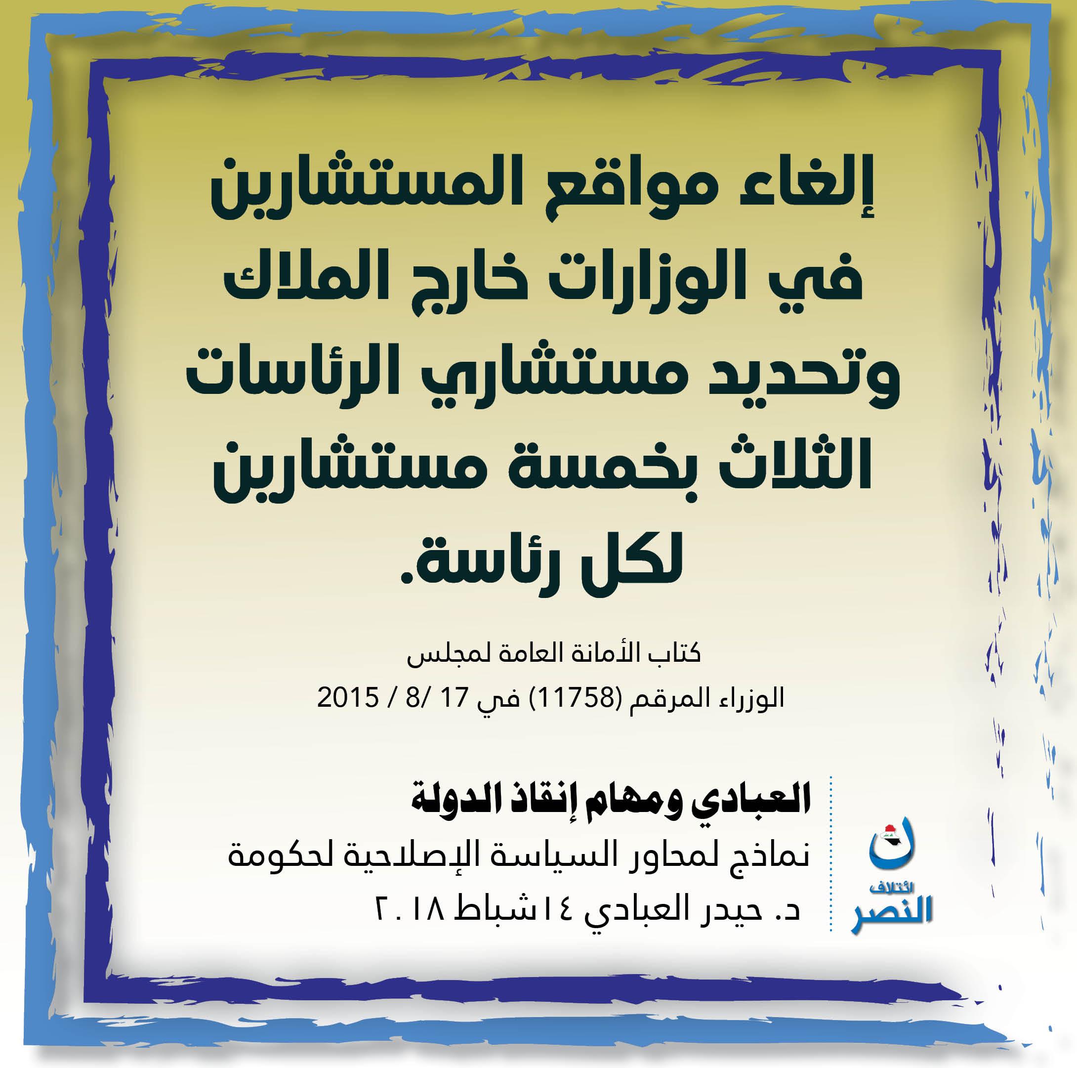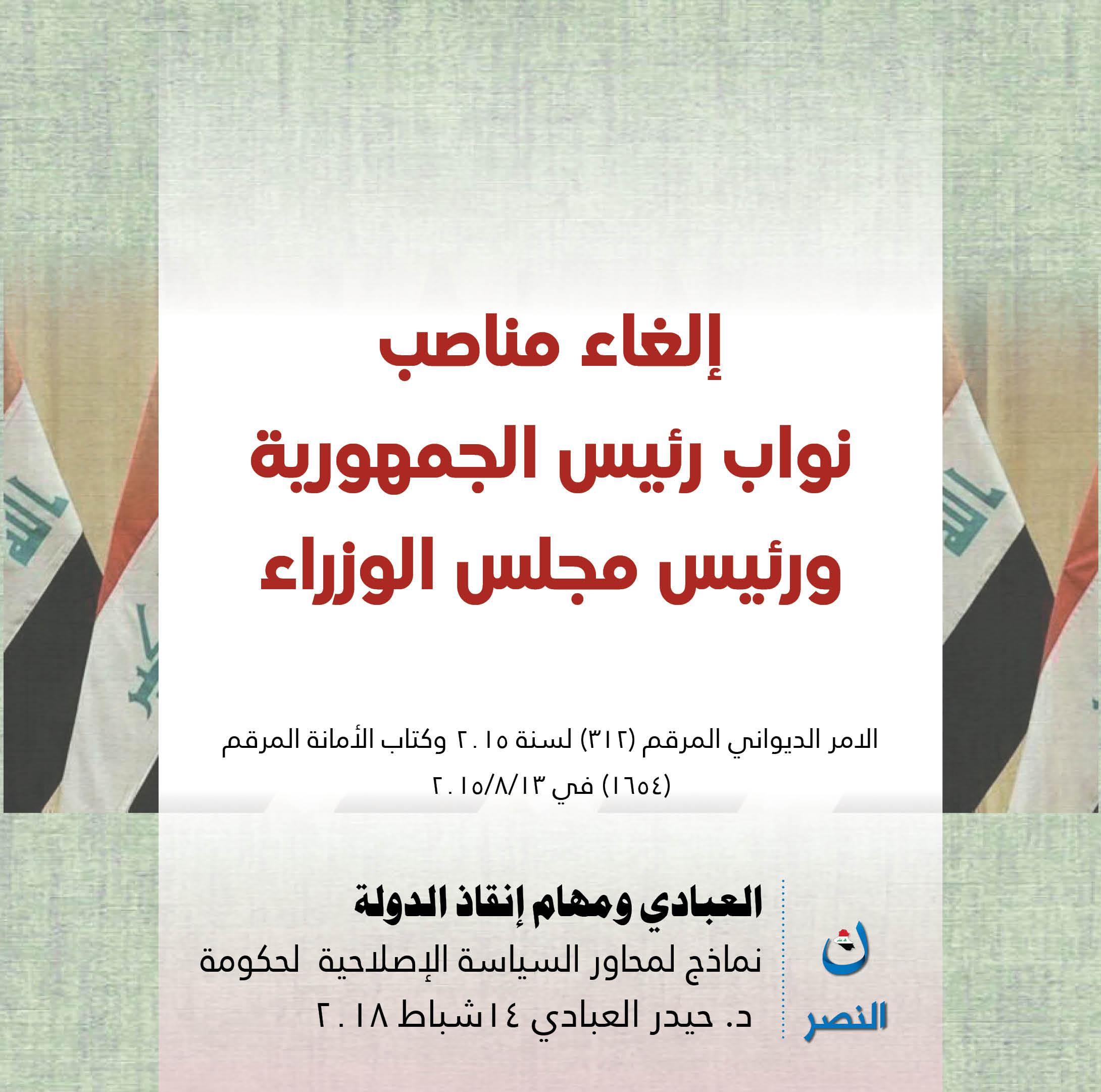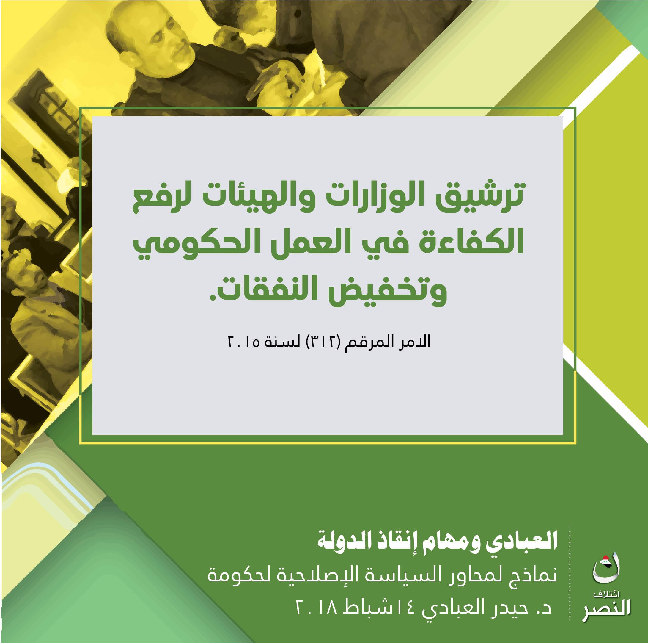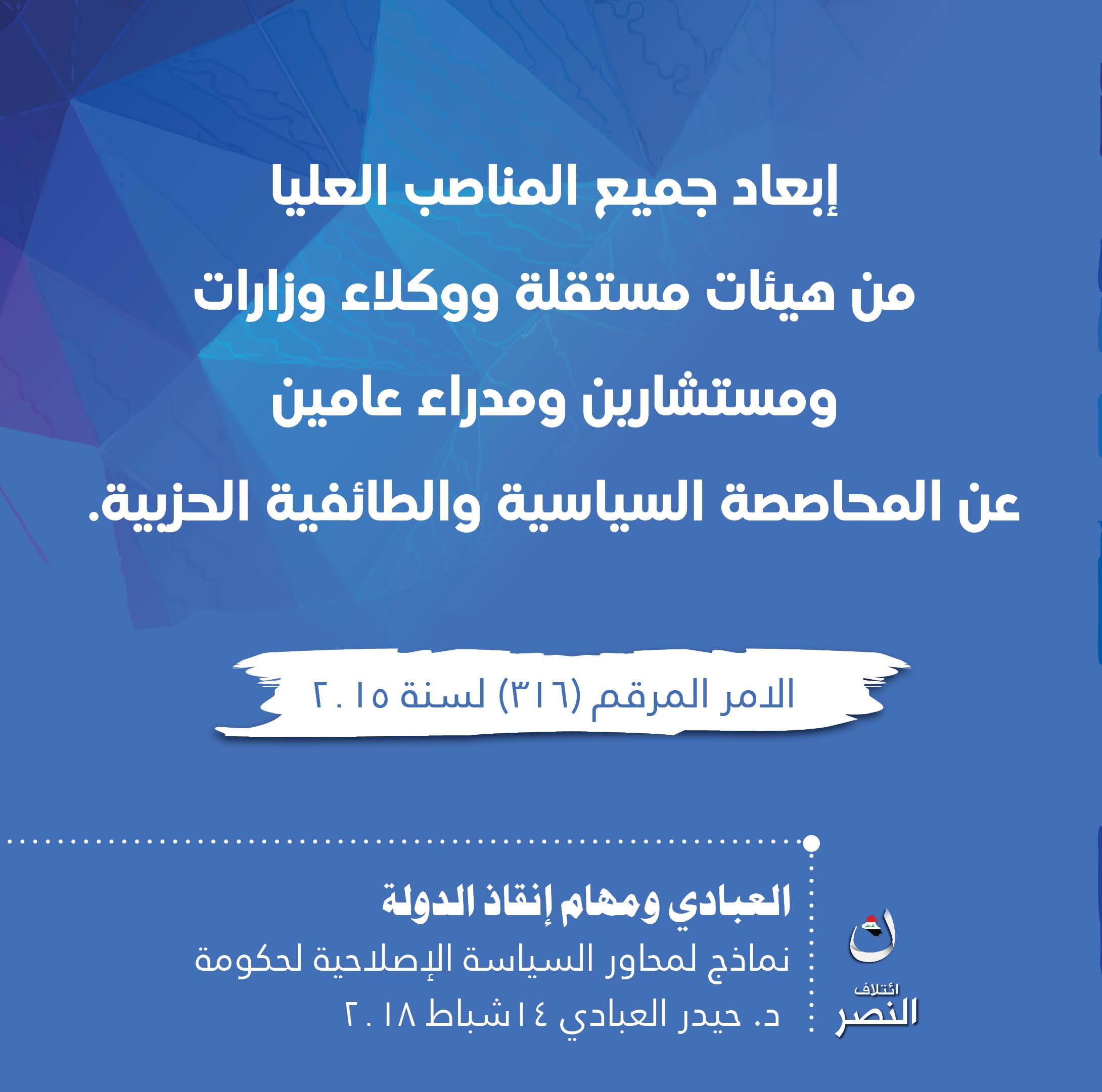 • إئتلاف النصر: مشروع وطني بقيادة الدكتور حيدر العبادي، يهدف لبناء وإدارة الدولة العراقية وفق مقومات الحكم الرشيد،.. يعمل لجميع العراقيين بقومياتهم وأديانهم وطوائفهم كافة، لتحقيق الوحدة والعدالة والسيادة والرفاه.