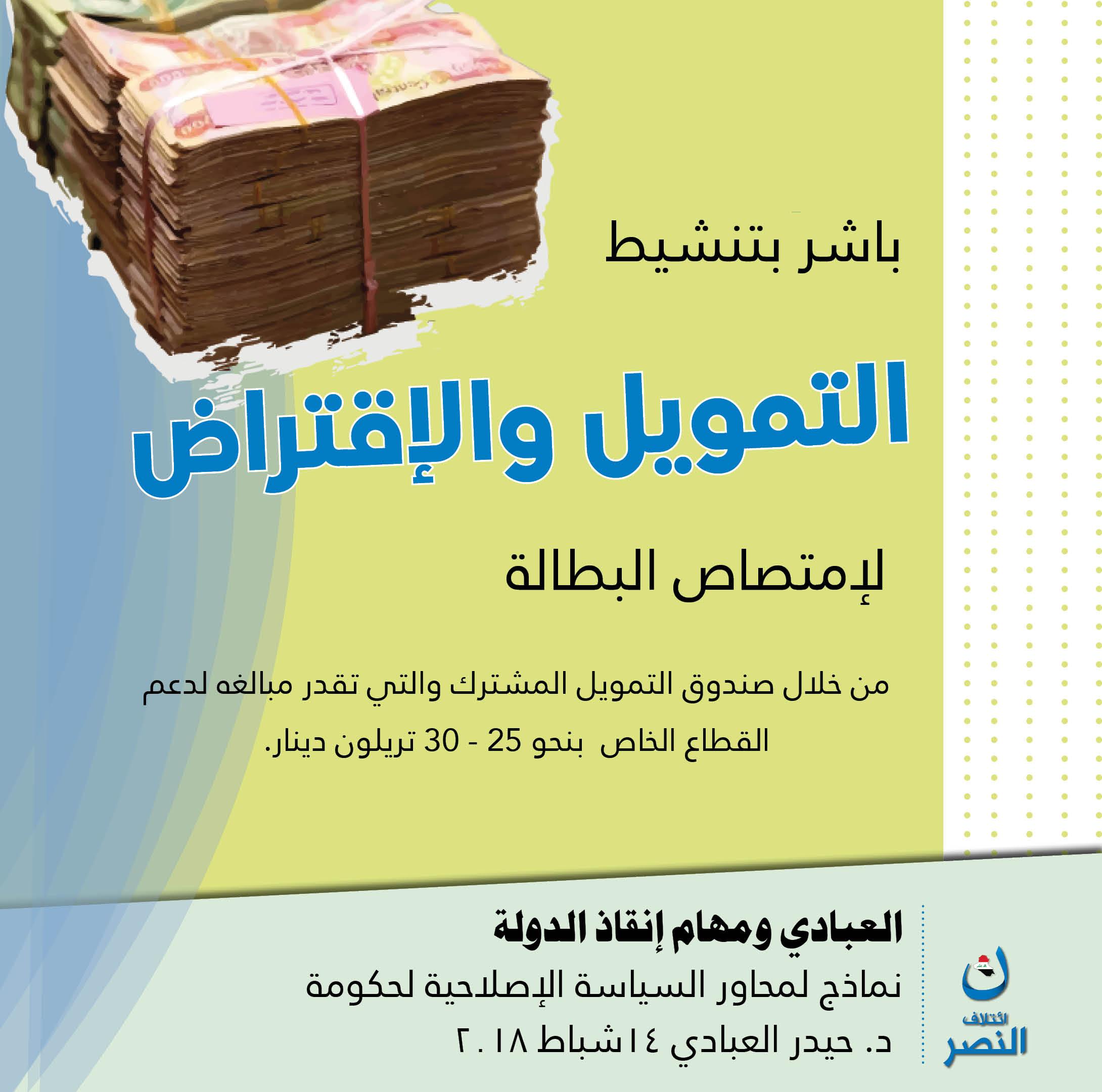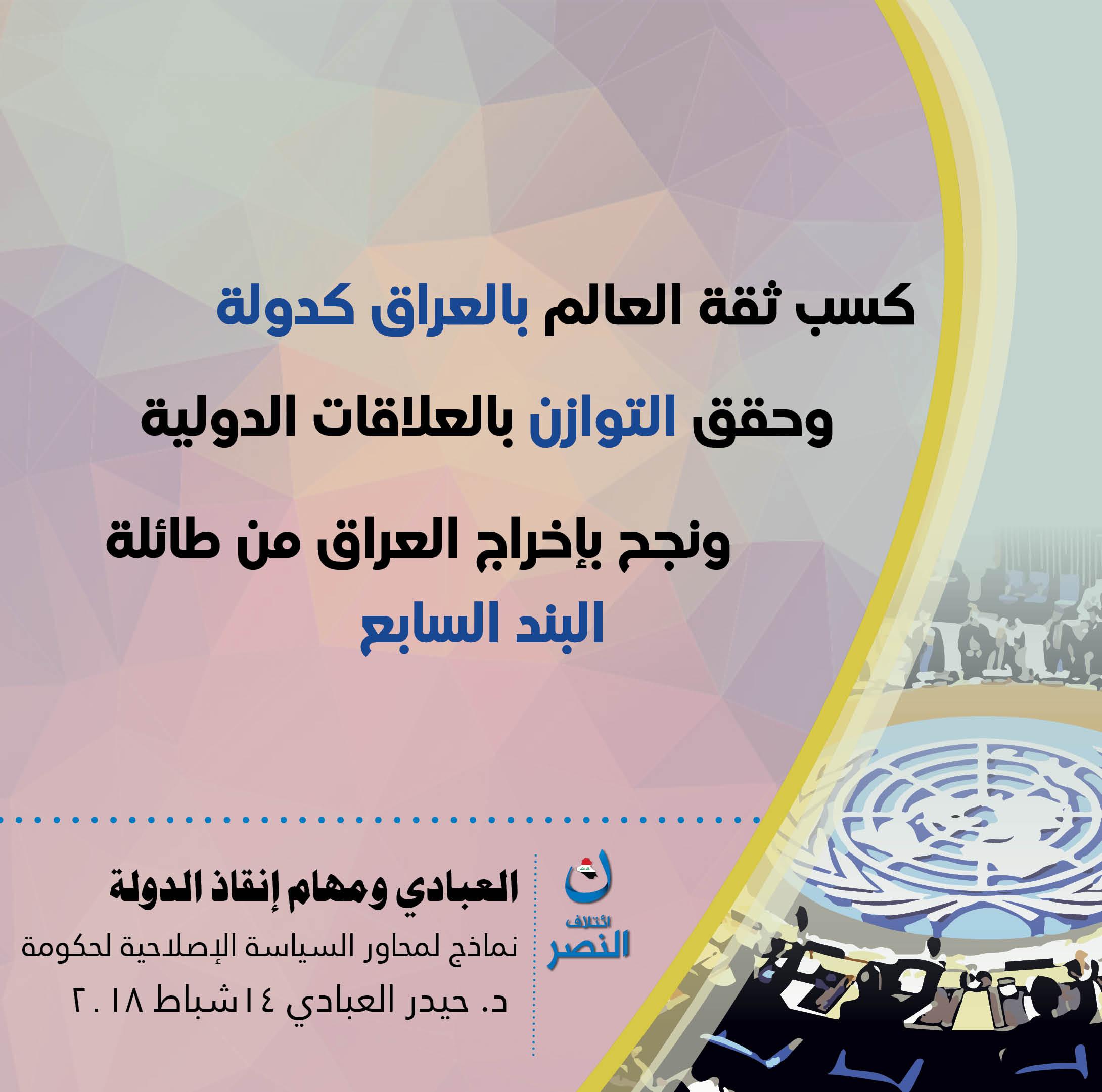 • إئتلاف النصر: مشروع وطني بقيادة الدكتور حيدر العبادي، يهدف لبناء وإدارة الدولة العراقية وفق مقومات الحكم الرشيد،.. يعمل لجميع العراقيين بقومياتهم وأديانهم وطوائفهم كافة، لتحقيق الوحدة والعدالة والسيادة والرفاه.