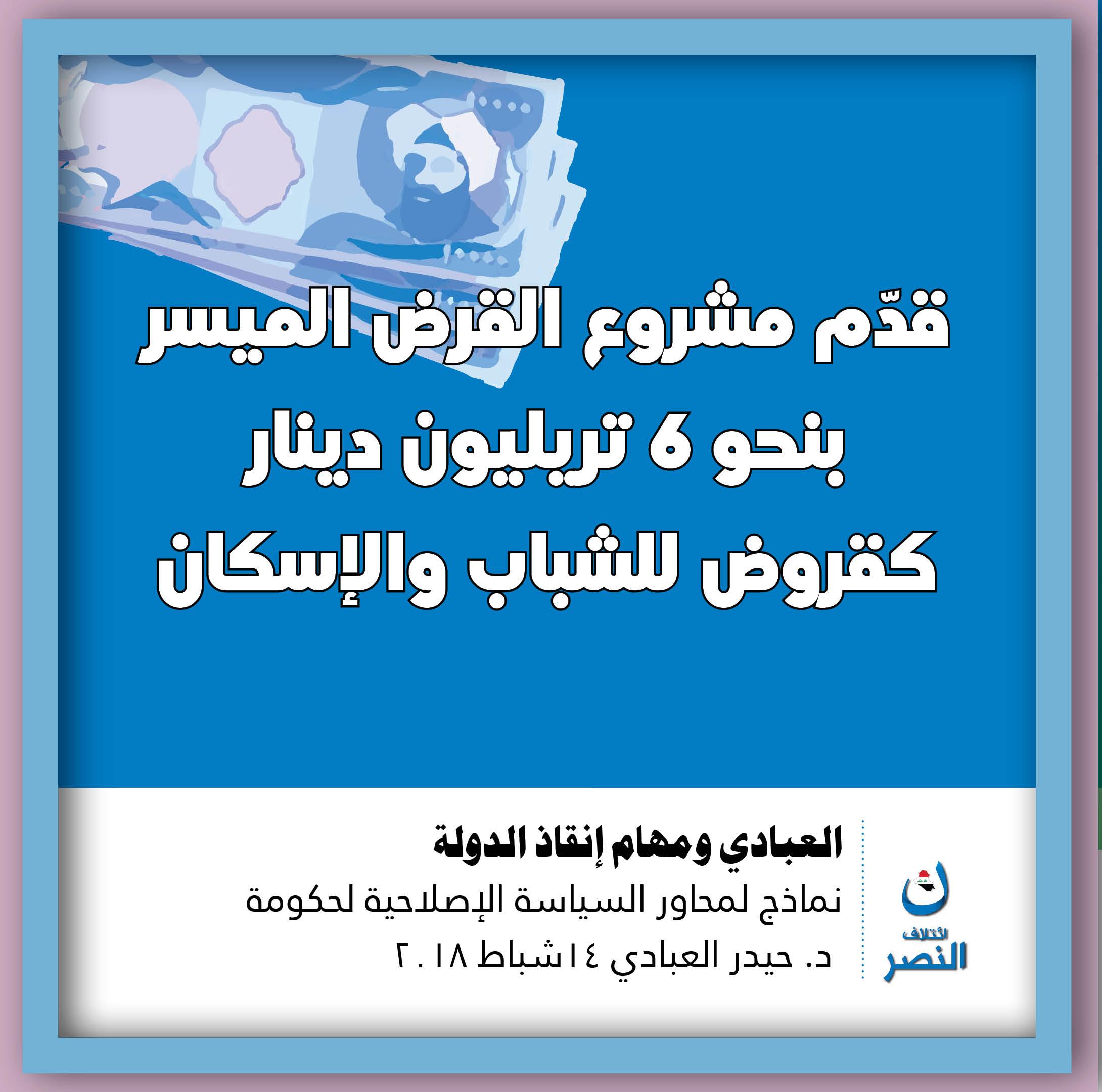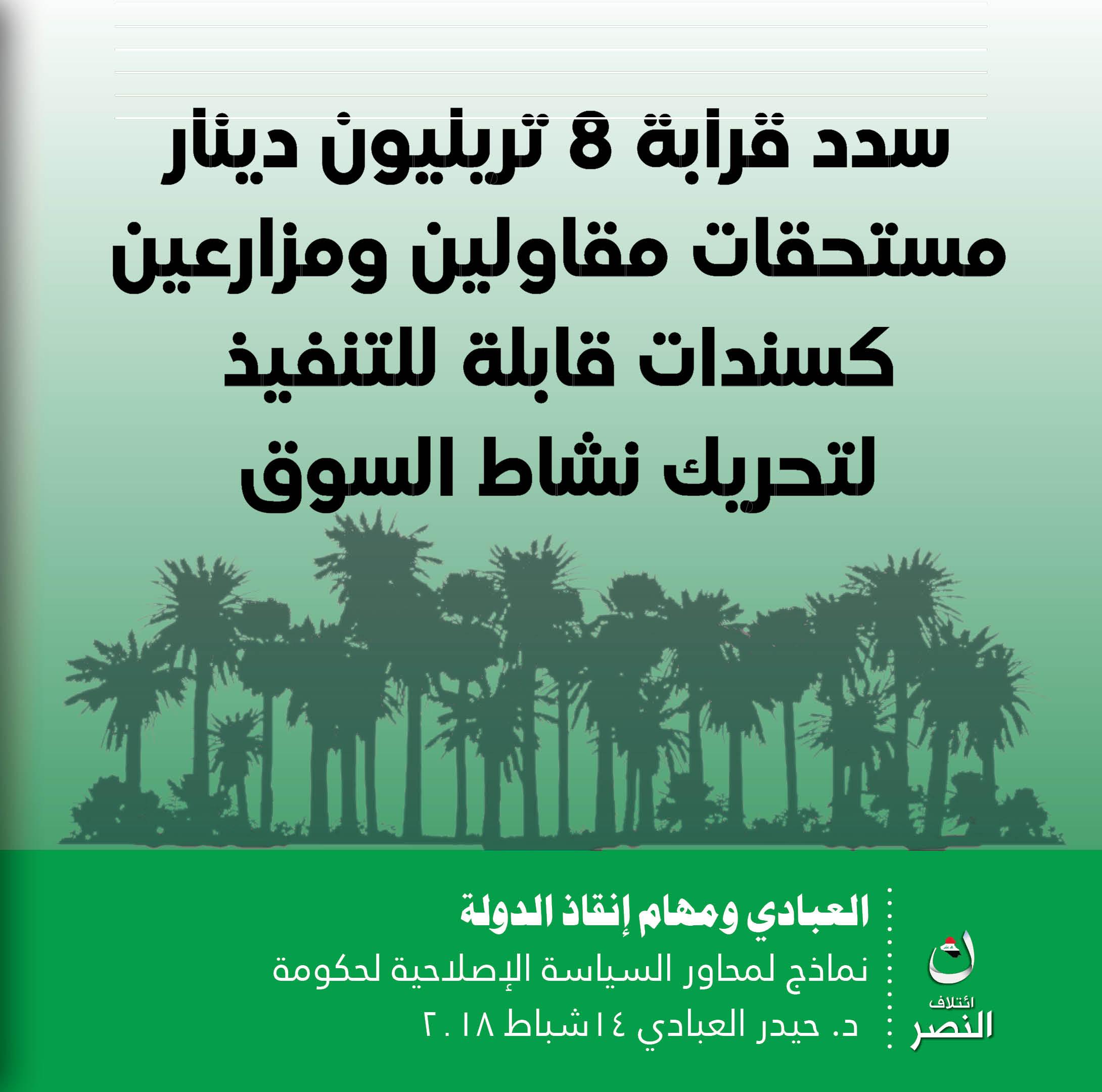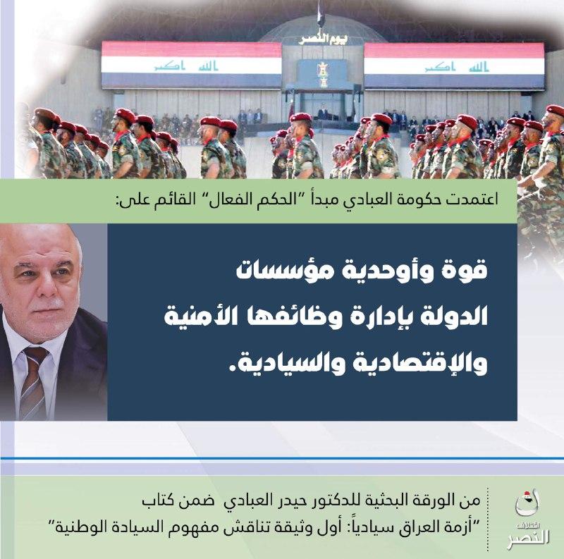 • إئتلاف النصر: مشروع وطني بقيادة الدكتور حيدر العبادي، يهدف لبناء وإدارة الدولة العراقية وفق مقومات الحكم الرشيد،.. يعمل لجميع العراقيين بقومياتهم وأديانهم وطوائفهم كافة، لتحقيق الوحدة والعدالة والسيادة والرفاه.