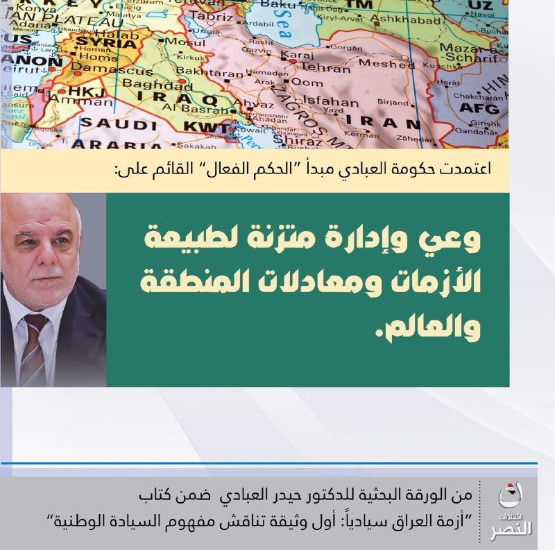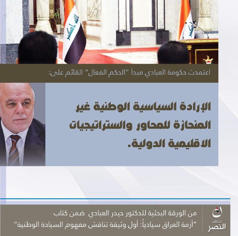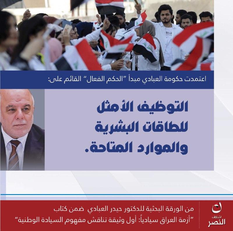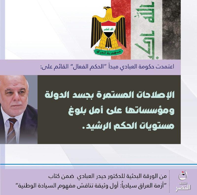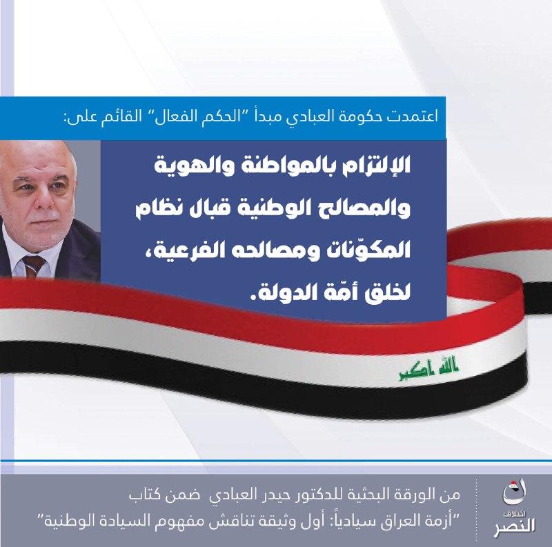 • إئتلاف النصر: مشروع وطني بقيادة الدكتور حيدر العبادي، يهدف لبناء وإدارة الدولة العراقية وفق مقومات الحكم الرشيد،.. يعمل لجميع العراقيين بقومياتهم وأديانهم وطوائفهم كافة، لتحقيق الوحدة والعدالة والسيادة والرفاه.