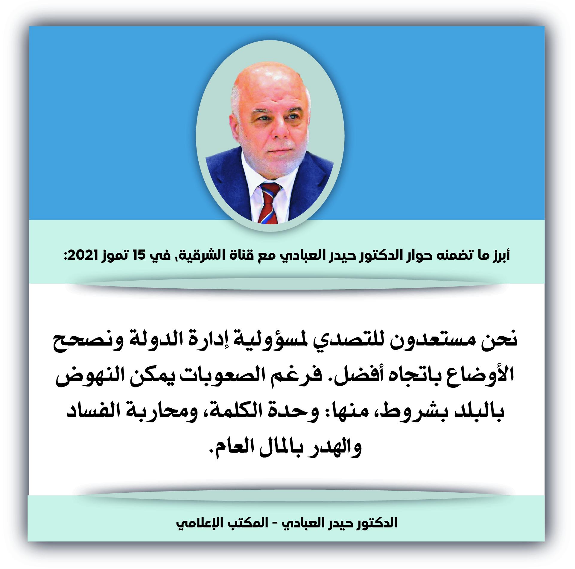 العبادي: حماية الناس وكرامتهم مسؤولية الدولة ويمكن إدارة الاقتصاد بموارد قليلة إذا انضبط الإنفاق