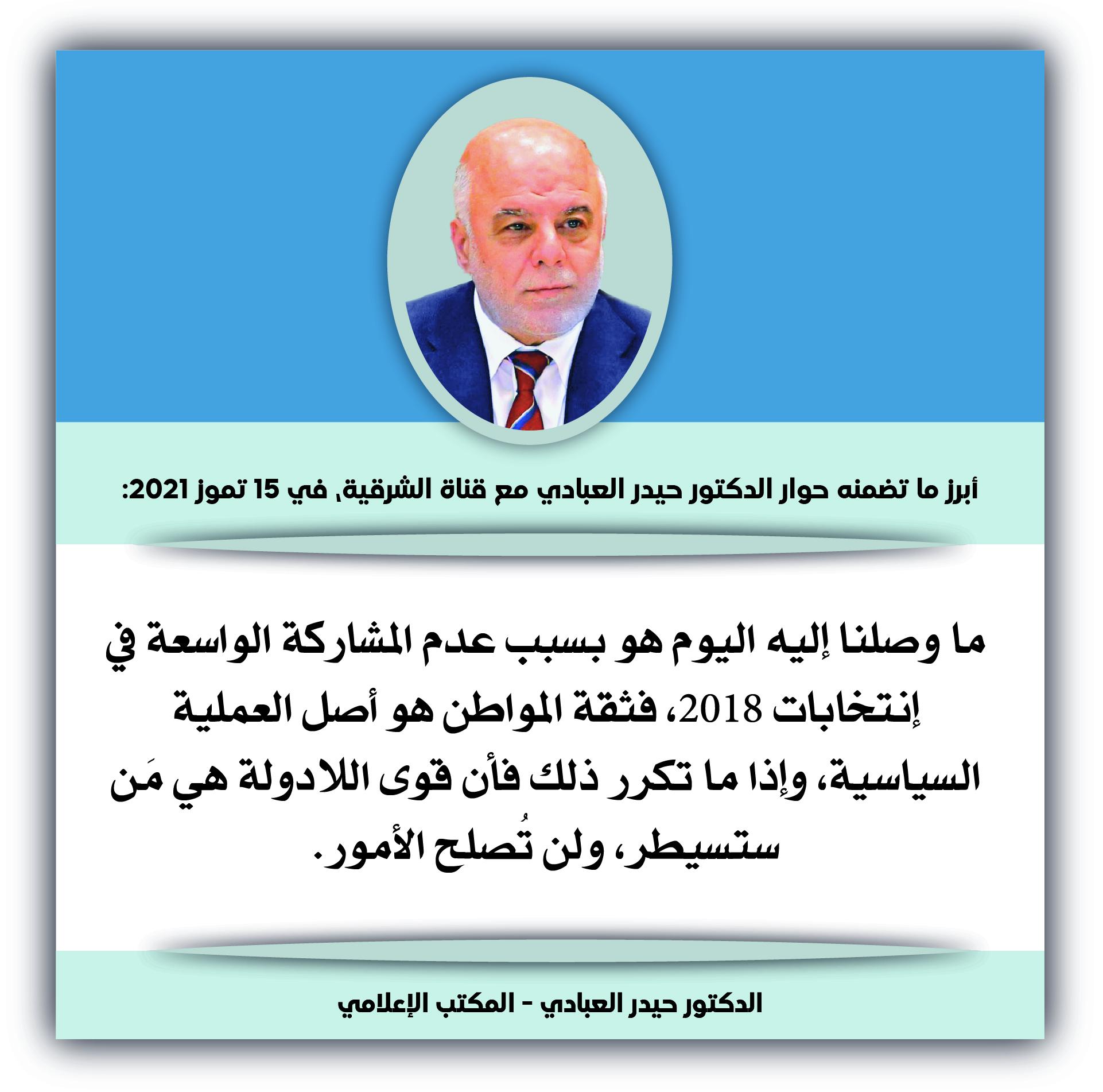 • إئتلاف النصر: مشروع وطني بقيادة الدكتور حيدر العبادي، يهدف لبناء وإدارة الدولة العراقية وفق مقومات الحكم الرشيد،.. يعمل لجميع العراقيين بقومياتهم وأديانهم وطوائفهم كافة، لتحقيق الوحدة والعدالة والسيادة والرفاه.