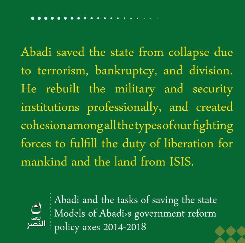• Al Nasr Coalition is a national project led by Dr. Haider al-Abadi, aims to build and manage the Iraqi state according to the elements of good governance. It works for all Iraqis, with all their nationalisms, religions, and sects, to achieve unity, justice, sovereignty, and welfare.